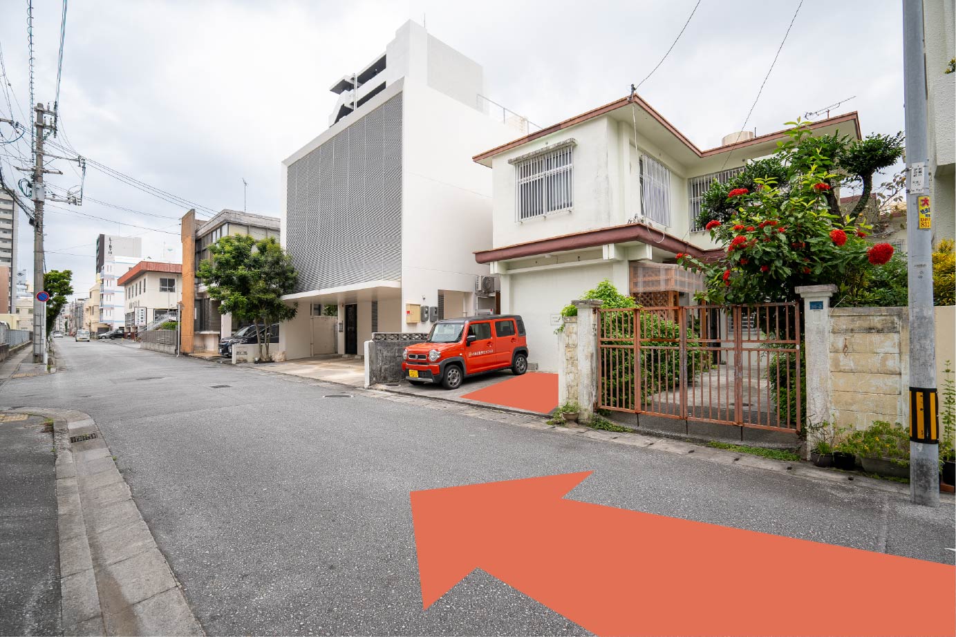 少し進むと、とまとカラーの車があります。(白くて大きな家の手前)